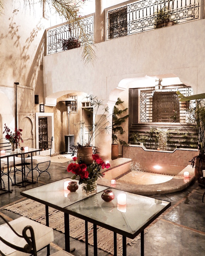 L’atterrissage a eu lieu vers 17h30 heure locale, le vol a duré 3h. Un taxi a été prévu par la Riad, ce qui était une bonne chose. J’ai été très effrayée par la circulation. C’est la première chose qui m’a frappé ici. Et puis, la seconde a été le passage dans les ruelles pour arriver au Riad : sombres, étroites, des murs très hauts et un vrai labyrinthe … Les 2 premières nuits se sont passées au Riad Dar Ten, typiquement marocain, exactement ce que je recherchai ! À la tombée de la nuit, avec toutes les lumières et les bougies, l’ambiance était vraiment chaleureuse, tout comme l’accueil du personnel. J’ai beaucoup apprécié, surtout ce petit thé à la menthe en guise de bienvenue (je ne sais pas combien j’ai pu en boire durant le séjour, mais qu’est ce que c’est bon !). Il faut savoir qu’à Marrakech, au mois de décembre en tout cas, il fait très froid le soir. Les températures avoisinaient les 0 degrés, contre plus de 20 degrés l’après-midi. Attendez-vous à prendre des coups de soleil et à choper un rhume (je parle en connaissance de cause ahahah) !