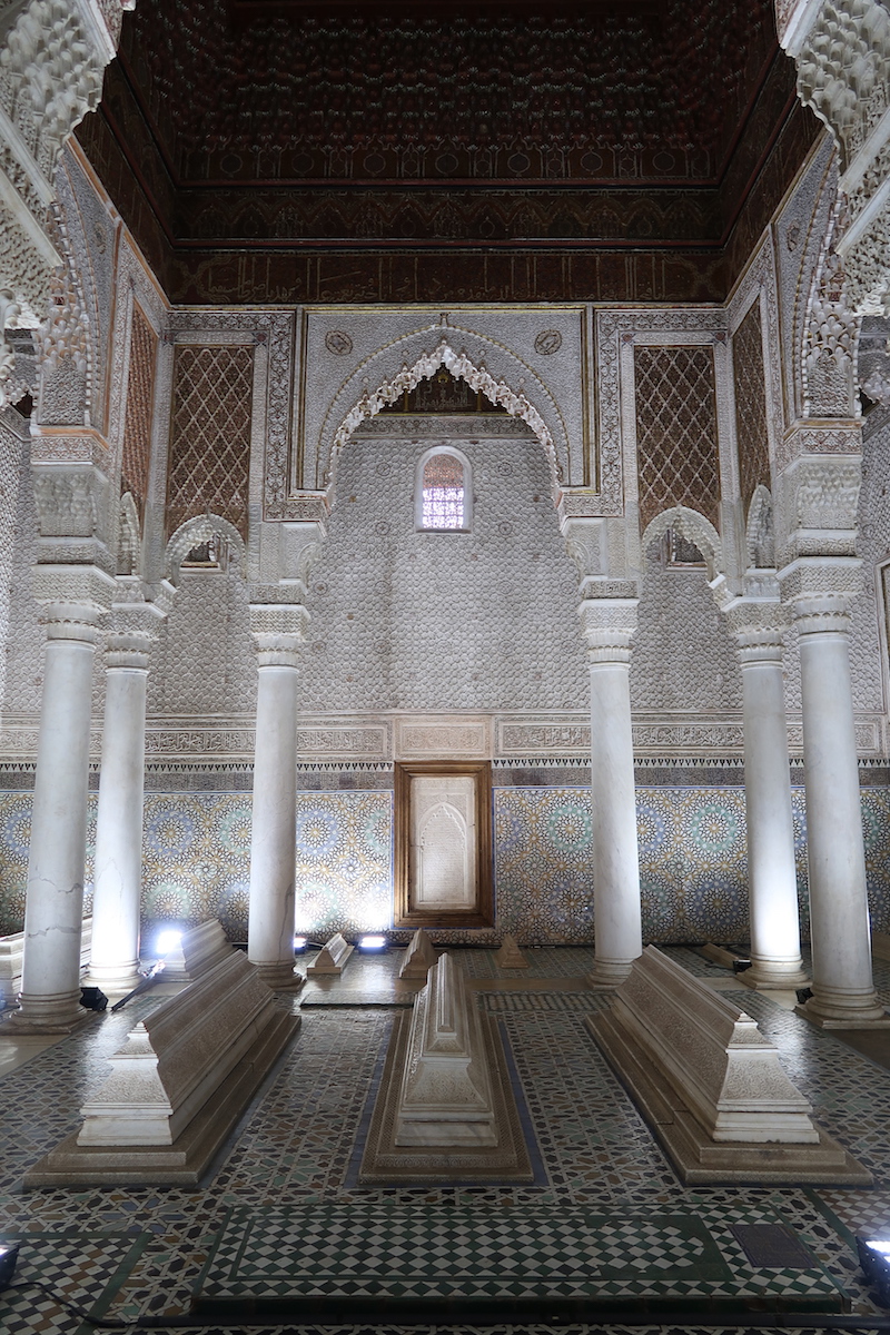 Le contraste a été total quand j’ai mis les pieds dans le Quartier d’Hivernage, puisqu’il se trouve à l’extérieur de la Médina. La journée n’est pas finie, on passe ensuite à la visite des Tombeaux Saadiens, qui coûte 10 Dirhams (environ 1€). La visite est courte mais à faire selon moi, l’architecture est incroyable et c’est quelque chose qui est trop peu citée dans les choses à faire en allant à Marrakech. N’oubliez pas d’aller y faire un tour ! En repassant par le souk, je dois dire que c’était étrange de voir de la viande coupée sur les étales juste à côté du passage, au milieu de la saleté et des pots d’échappements … Dans les ruelles d’ailleurs, il faut faire attention car les voitures et les mobylettes passent très très près de nous.